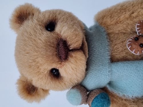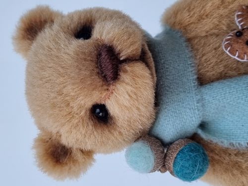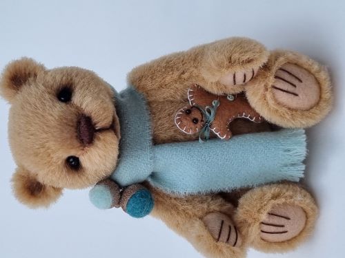 He has black glass eyes, hand-shaded facial features and scissor-sculpting. Louis wears a pale blue wool scarf around his neck decorated with tiny acorns and also holds a handmade felt gingerbread man.