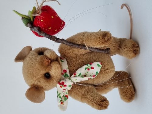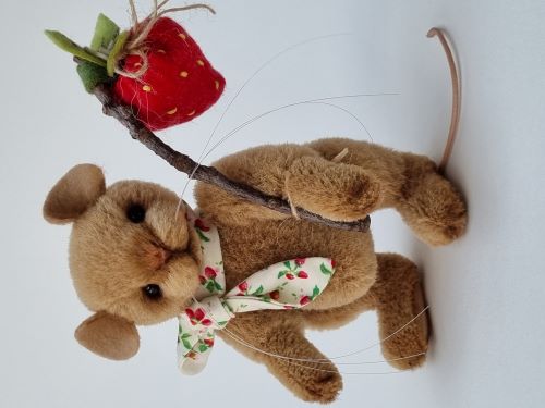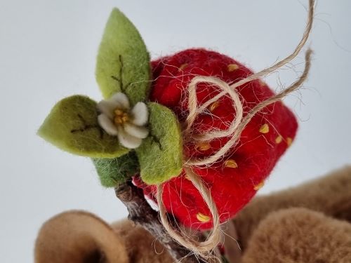 She has black glass eyes, hand-shaded facial features and scissor-sculpting. Lucy wears a cute strawberry print fabric scarf around her neck and carries a handmade felt strawberry napsack.